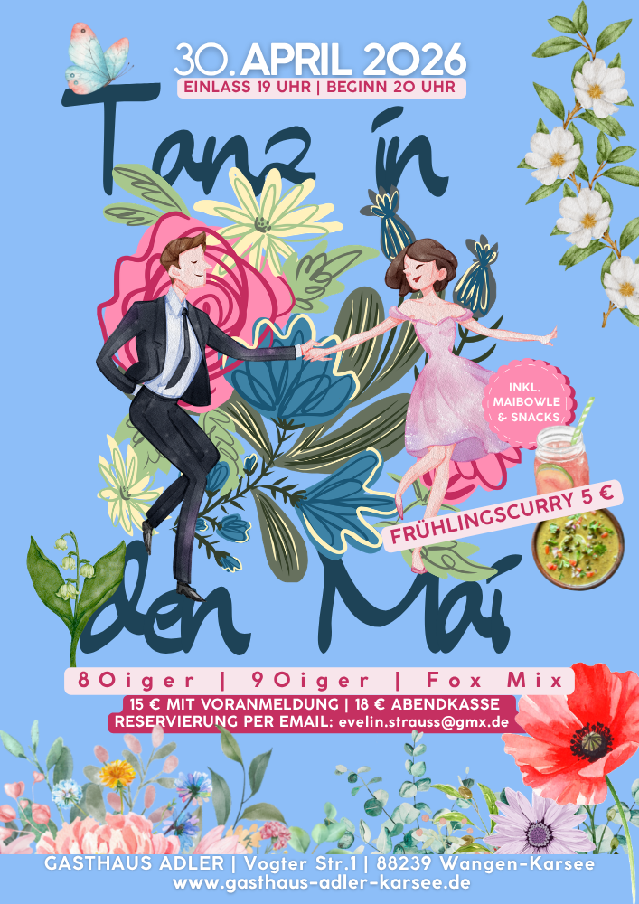 Ab 19:00 Uhr: Bens Chili con & sin Carne Ab 20:00 Uhr: Workshop Ab 21:00 Uhr: Salsa Fiesta Workshop 10,00 € Fiesta mit Essen 12,00 € Fiesta ohne Essen 7,00 € - Wir freuen uns auf EUCH! Anmeldung über Jacqueline: hallo@gasthaus-adler-karsee.de