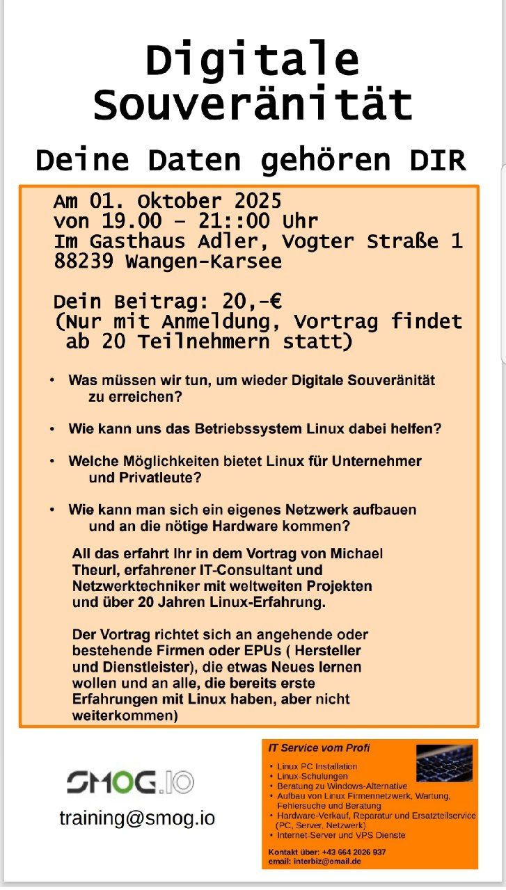 Was müssen wir tun, um digitale Souveränität zu erreichen? Wie kann uns das Betriebssystem Linux dabei helfen? Welche Möglichkeiten bietet Linux für Unternehmer und Privatleute? Wie kann man sich ein eigenes Netzwerk aufbauen und an die nötige Hardware kommen? All das erfahrt ihr in dem Vortrag von Michael Theurl, erfahrener IT-Consultant und Netzwerktechniker mit weltweiten […]