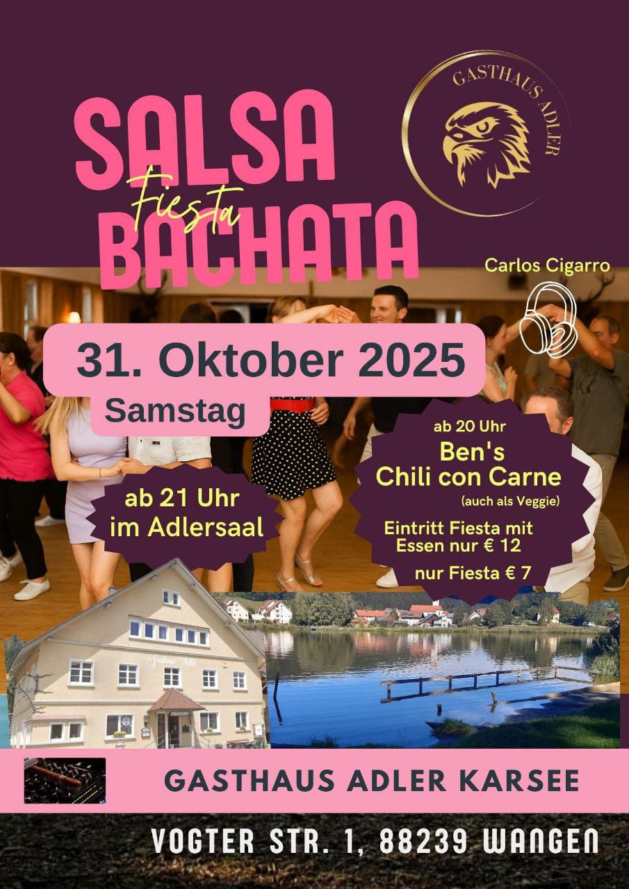 Ab 20:00 Uhr Bens Chili con Carne Ab 21:00 Uhr Salsa Bachata Fiesta Fiesta mit Essen 12,00 € Fiesta ohne Essen 7,00 € - Wir freuen uns auf EUCH! Anmeldung über Jacqueline: hallo@gasthaus-adler-karsee.de
