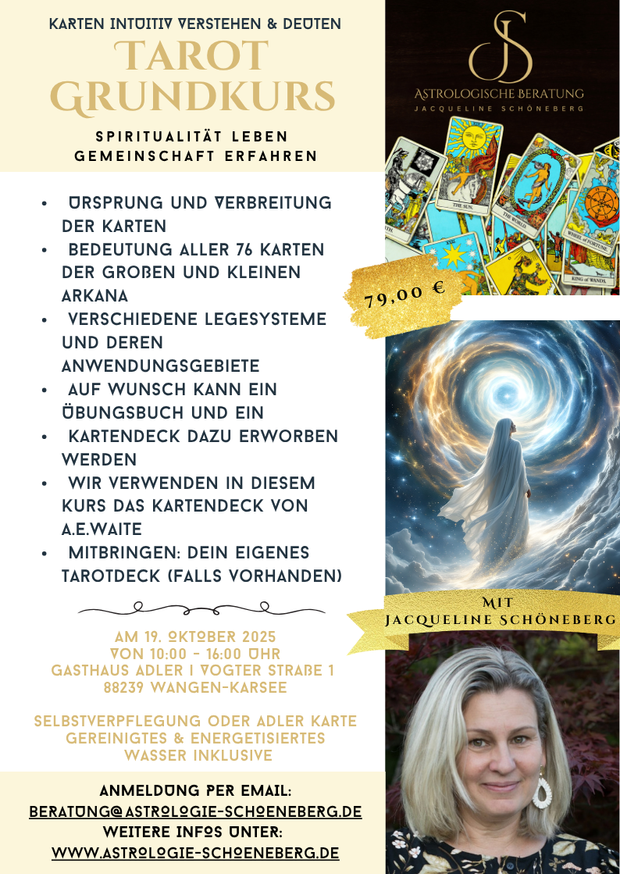 Schlüsselworte Im Tarot – Karten intuitiv verstehen & deuten Entdecke die Kraft der Schlüsselworte im Tarot! Grundlagenworkshop: Schlüsselworte im Tarot – mit Jacqueline Schöneberg Dieser Workshop ist für Einsteiger konzipiert. Was dich erwartet: ✨ Ursprung und Verbreitung der Karten ✨ Bedeutung aller 76 Karten der großen und kleinen Arkana ✨ verschiedene Legesysteme und deren Anwendungsgebiete […]